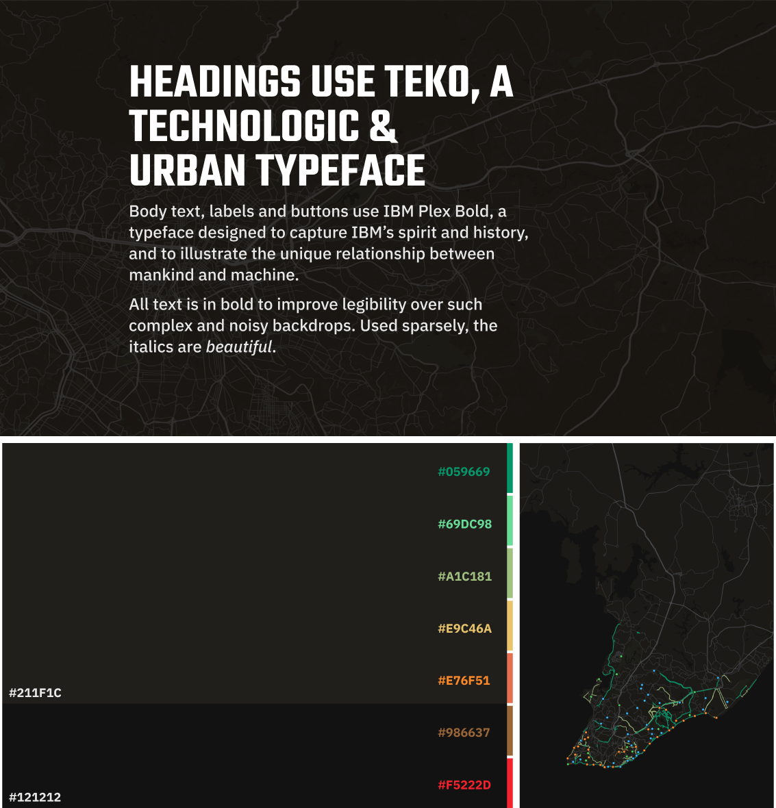 With the typography and basic palette set, I started customizing the Mapbox base map and the Ant Design components to match the style. Mapbox Studio is a formidable tool with very advanced features for customizing the interactive map that’d be used as the base layer, going way beyond colors and line widths to advanced data filters.