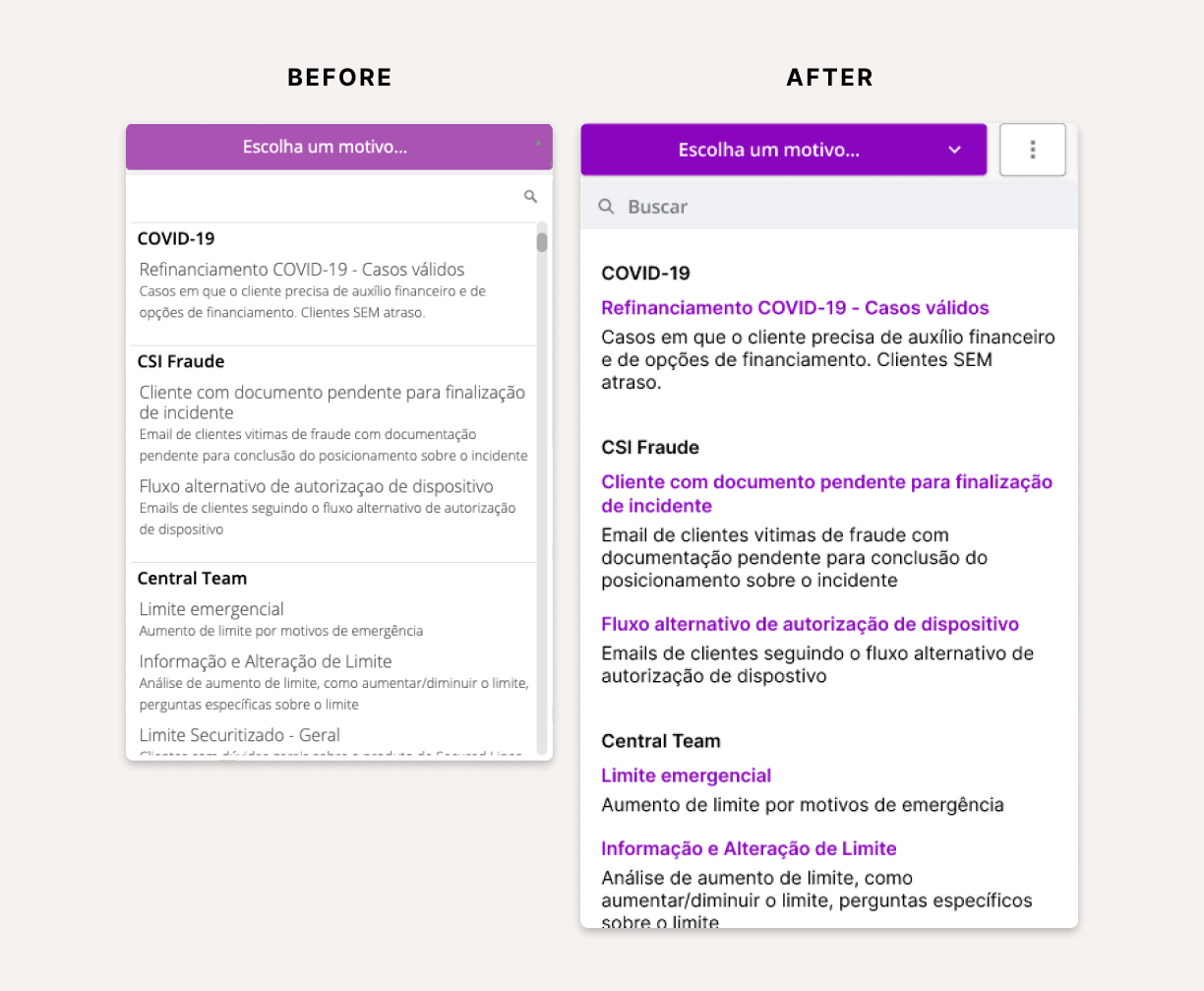The Contact Reason Dropdown was a crucial part of the Shuffle UI and was a great low-hanging fruit. The original version had serious legibility issues, so we quickly redesigned it and added keyboard shortcuts to improve agents' speed when doing this mandatory step.