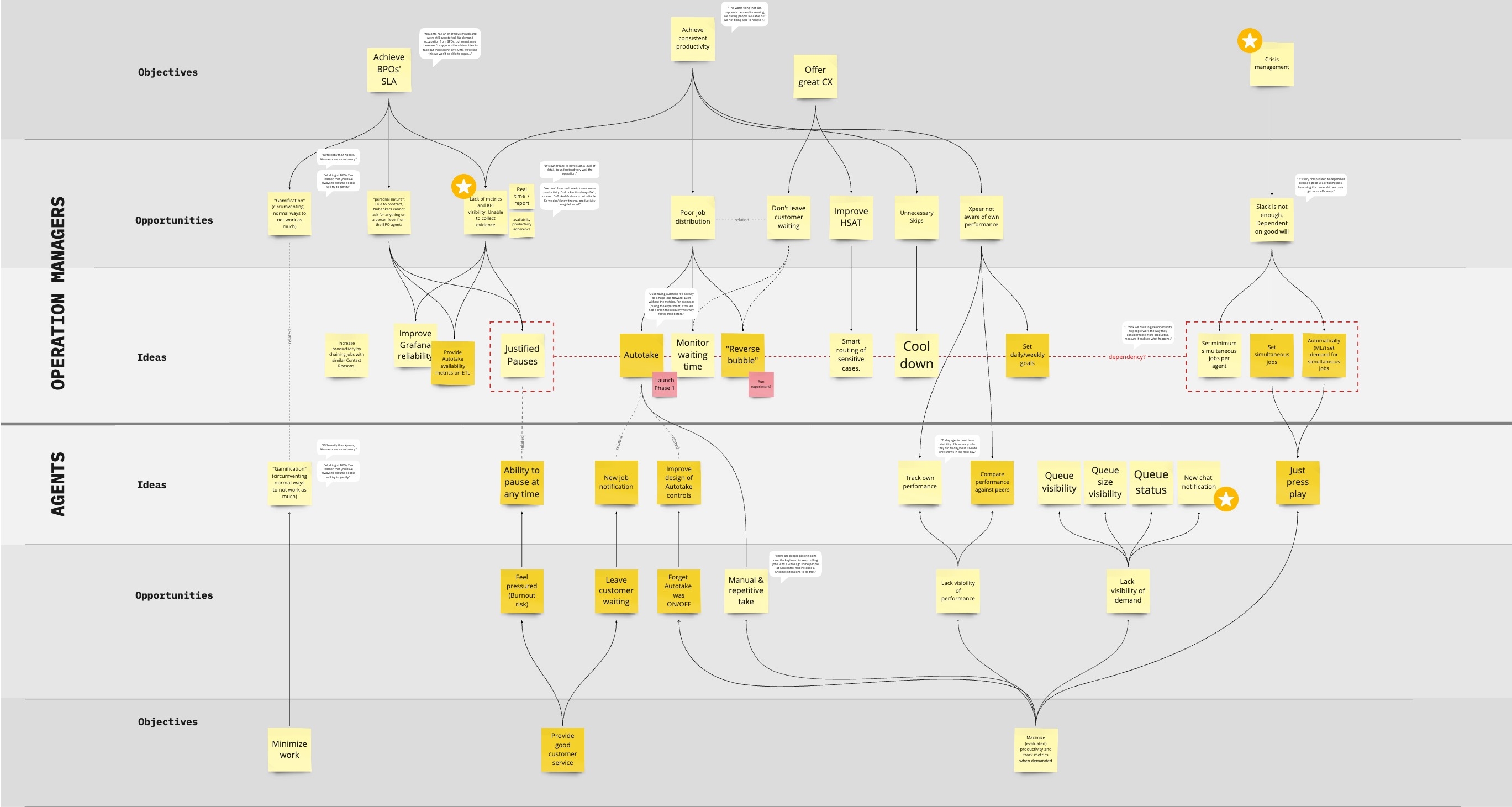 When developing Autotake, an interesting tool I devised to make sense of the problem was a double-headed Opportunity Tree, with one side the agents and the other their managers. This helped us find solutions, in the middle, that could solve the sometimes conflicting needs of these two users. Click to see it larger.